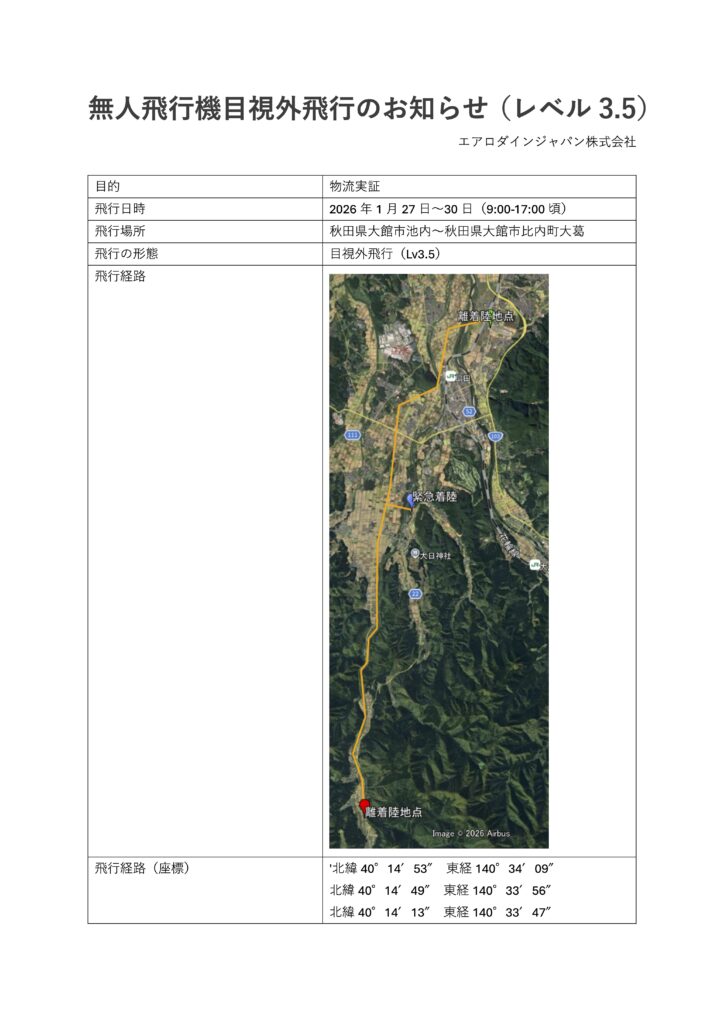 無人航空機の飛行のお知らせ(秋田県) 2026年1月20日 最終更新日時 : 2026年1月29日 AerodyneJapan 2026年1月27日〜30日、秋田県大館市内で無人航空機目視外飛行を行いますので、おしらせいたします。 Follow me! FacebookXBlueskyHatenaPocketCopy