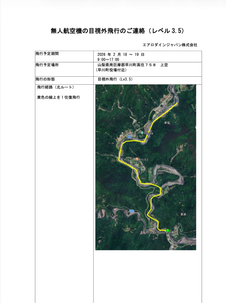 無人航空機の飛行のお知らせ(山梨県) 2026年2月16日 最終更新日時 : 2026年2月18日 AerodyneJapan 2026年2月18-19日、山梨県早川町内で無人航空機目視外飛行を行いますので、おしらせいたします。 Follow me! FacebookXBlueskyHatenaPocketCopy
