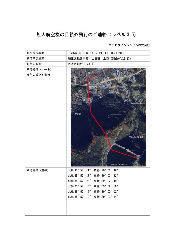 2026年3月17-19日、埼玉県秩父市内で無人航空機目視外飛行を行いますので、おしらせいたします。